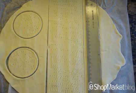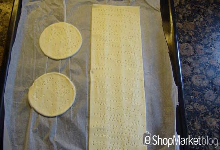 Cortamos la masa por la parte central en dos mitades rectangulares con ayuda de una regla. Utilizamos una de estas mitades y la pinchamos por toda la superficie con un tenedor, congelando el resto de hojaldre para que no se estropee. Precalentamos el horno a 200 º C e introducimos en su interior la masa de hojaldre ya cortada y pinchada, horneándola durante 15 minutos hasta que esta quede dorada. Otra sugerencia de presentación sería dividir la otra mitad del hojaldre en porciones individuales marcando con un vaso, recortando el borde circular para hacer tartaletas. El resto del procedimiento es exactamente igual que para la banda.